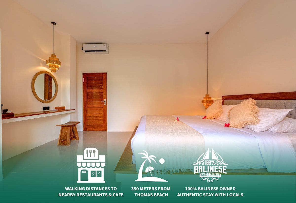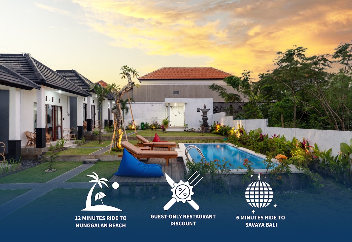 100% Balinese Owned - Authentic Stay With Locals Welcome to our tranquil guesthouse oasis in the heart of Uluwatu! Nestled in a valley yet only steps away from vibrant streets filled with trendy cafes, shops, and lively local life, this guesthouse offers a unique blend of relaxation and excitement. Features: - King-sized bed with ensuite bathroom - Air conditioning for a comfortable night’s sleep - Outdoor seating area in select rooms - Wi-Fi throughout the property