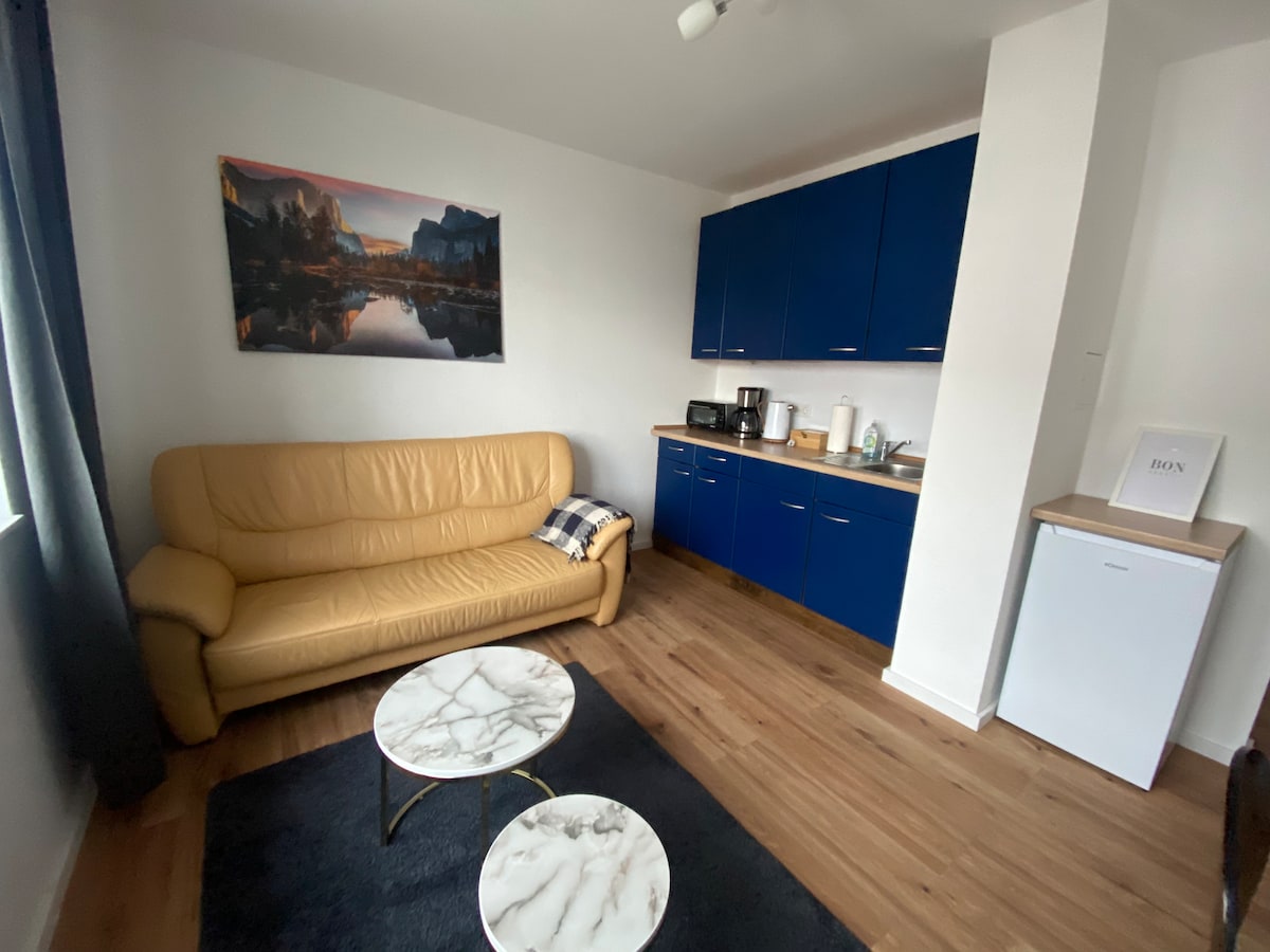 Wir bieten ein kleines, gemütliches und liebevoll eingerichtetes ca. 34 qm großes Appartement in unserem Wohnhaus an. Es verfügt über einen eigenen Eingang, einen Wohn-Essbereich mit einer Singleküche, einen kleinen Flur und einem Bad mit separater Toilette. Die bequeme Sitzcouch kann sehr leicht zu einem Bett 1,60 x 2,00 Meter umgestaltet werden. In der Küche befindet sich ein Kühlschrank, 2 Ceranfeldplatten, Mikrowelle, Wasserkocher, Kaffeebereiter, Toaster, Töpfe, Pfanne etc.