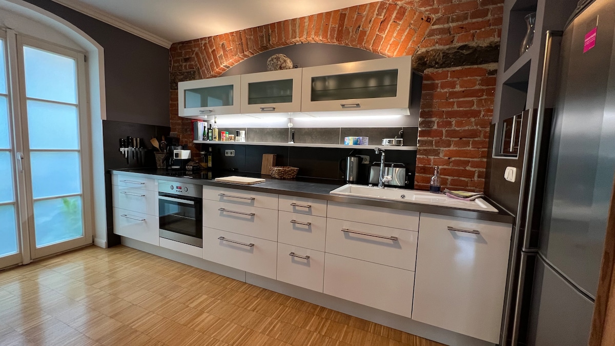 Modern 4 1/2-room apartment (100m2) over 2 floors in the beautiful old town of Pirna, yet quiet and located directly on Malerweg (Dresden-Saxon Switzerland). With castle view, small terrace. There are many hiking and biking tours in the immediate vicinity to explore, as well as a great cultural diversity (Elbe steamboat ride, castles, Königstein, Dresden is 16 km away) is available. Nice restaurants within walking distance. Parking in the nearby parking garage.