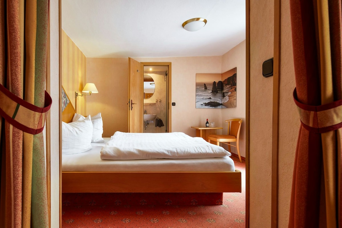 The double room is equipped with a bathroom (shower + toilet, hair dryer and cosmetic mirror), LED TV, desk, room safe and internet access via W-LAN. We have children's beds and baby beds available for our little guests. As a house service, these are included in the room price. Sun-seekers can use our spacious balcony with sun loungers. Our rooms can also be easily reached by guests with restricted mobility via a stair lift.