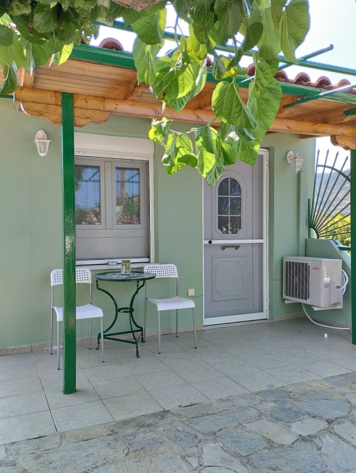 Apartment with great views across the Gulf of Evia and direct access to small pebble beach. The main room contains a double bed, kitchenette and dining area. There is a separate room with two more single beds that can be combined into a double bed. Private bathroom. Access to terrace overlooking the sea and the mountains of the Greek mainland. Authentic Greek village with friendly neighbours.