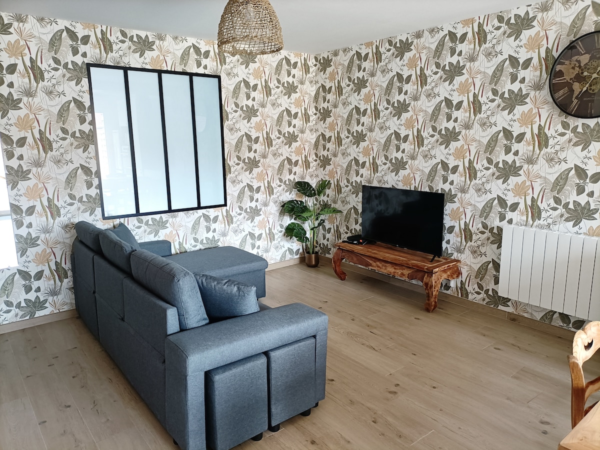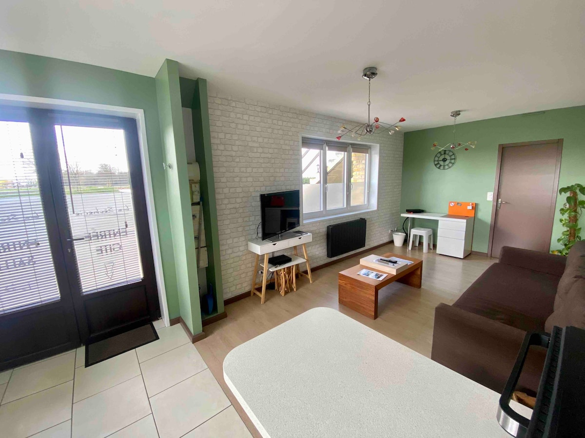 idéal lors de vos déplacements professionnels En rase campagne, dans une ancienne sècherie à chicorée Appartement T2 entièrement rénové de 45m² avec parking privé et jardin • Cuisine équipée (8m²) ouverte sur séjour: plaque induction, réfrigérateur/congélateur, micro-ondes , bar, cafetière, grille-pain, bouilloire • Séjour (18m²) : canapé convertible, espace bureau, TV . • Chambre (14m²) : lit double 160 /200 + dressing. • Salle de bains : WC, douche à l’italienne 80/100, lavabo, lave-linge