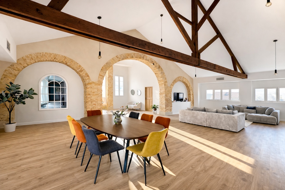 ✨ Loft d’exception au cœur d’Orange ✨ Lieu unique de 200 m² au charme atypique, avec arches voûtées, pierre apparente et volumes spectaculaires. Ce loft de standing offre 3 suites élégantes avec salle de bain privative, salon spacieux, salle à manger conviviale et cuisine moderne entièrement équipée. Détendez-vous dans le jacuzzi, puis prolongez la magie autour d’un apéritif ou d’un dîner face au Mont Ventoux et aux monuments d’Orange. Autoroute à 1 min, centre à pied, parking gratuit.