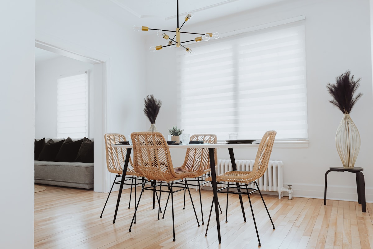 Cozy Charm in a 1935 Historic Gem! Beautifully renovated vintage 2 storey home with a rustic exterior, nestled in downtown Drummondville, steps away from the best & most iconic restaurants in town. Ideal for families and business travelers alike, it features A/C, King & Queen bed, dedicated office, full bath, half bath, washer/dryer, fast wifi & Roku TVs. Enjoy every thoughtfully planned amenity. 2 cars tandem dedicated parking included—comfort, character & convenience in one! CITQ320059