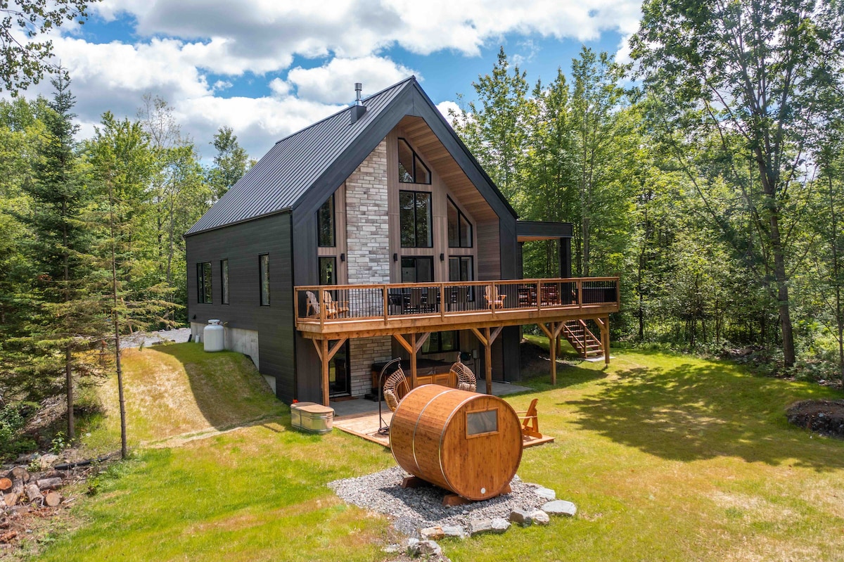 Monumental open concept, in the heart of nature. Access to trails directly behind the house. Wood stove, large modern bathroom, one bedroom + sofa bed. Another sofa bed in the living room. Ideal chalet for a couple with children or two couples. Wild birds, turkey, and deer lovers welcome! Wifi and EV charger included. Dogs Welcome! CITQ : #308038