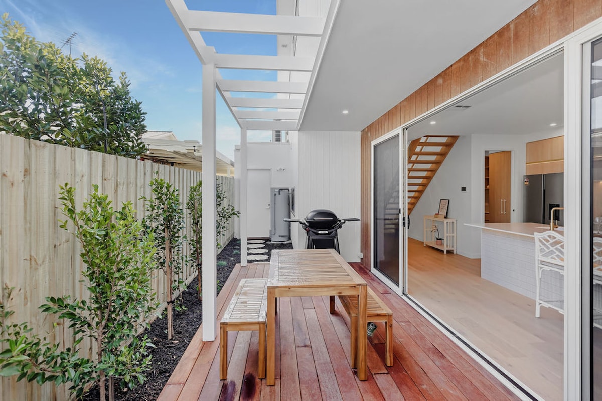 Situated just 100m walk from the beach, welcome to our cute and funky beach house. 3 bedrooms (linen and towels provided) , Gally Kitchen, new bathroom & includes workspace retreat with fast reliable WiFi, Netflix, Amazon Prime, Disney+ and Playstation 3. Sit back and relax on the raised decking with bay views! Close to wineries, shopping & cafes. Ideally suited to 2 couples and 2 Children. Portacot (No linen), & toddler high chair available on request.