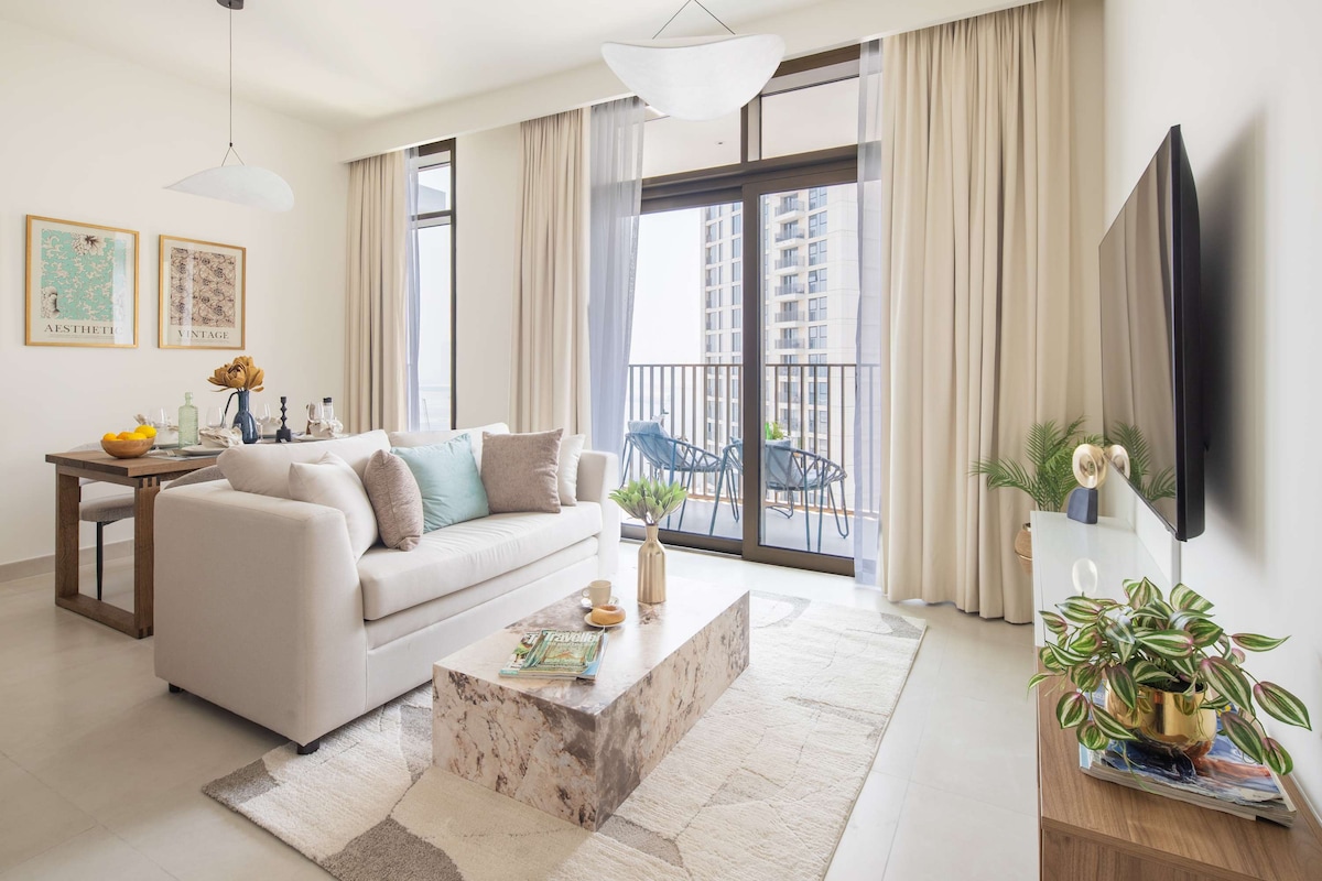 Stay in a uniquely styled 1-bedroom apartment in the luxurious waterfront Palace Residences at Dubai Creek Harbour. This 66 sqm home is fully equipped with everything you need, featuring a bright living area and private balcony with breathtaking skyline views. Guests enjoy premium amenities including a top pool, modern gym, and 24/7 security. Perfectly connected, just 15 minutes from Downtown Dubai and the airport, it’s the ideal base for your Dubai stay.