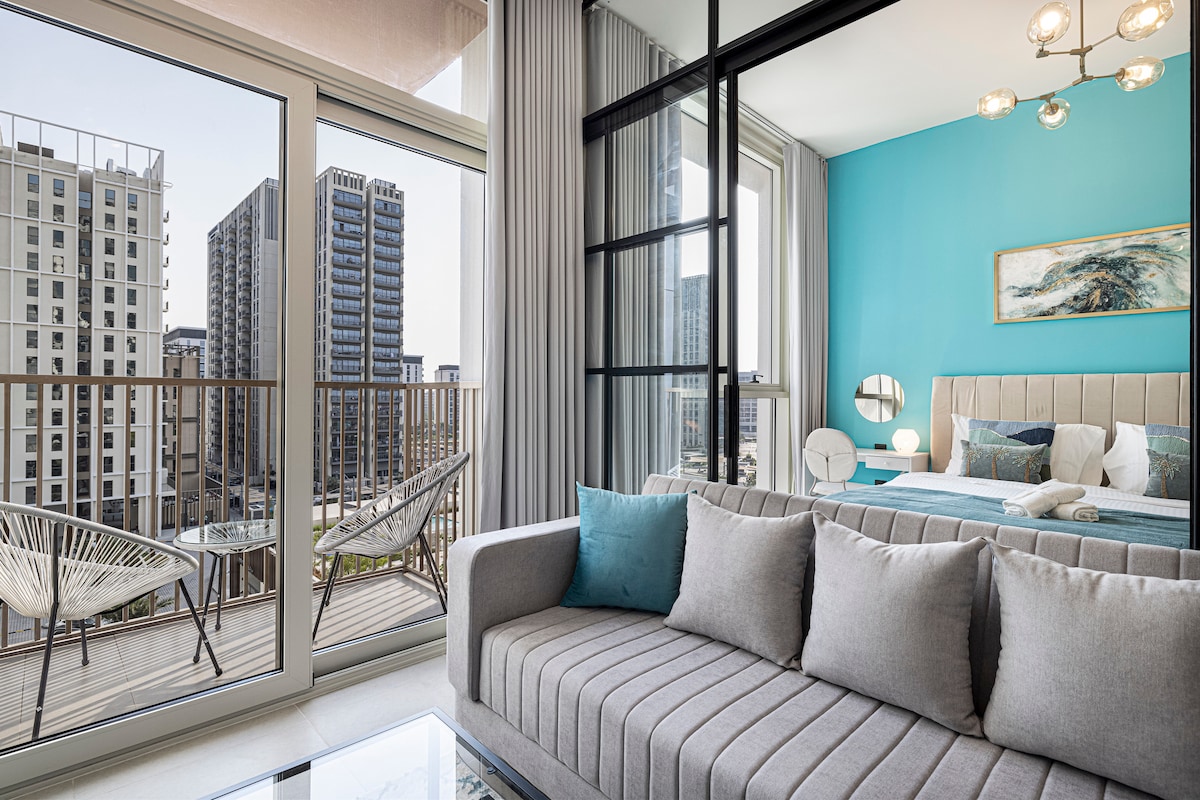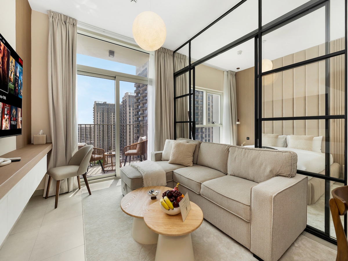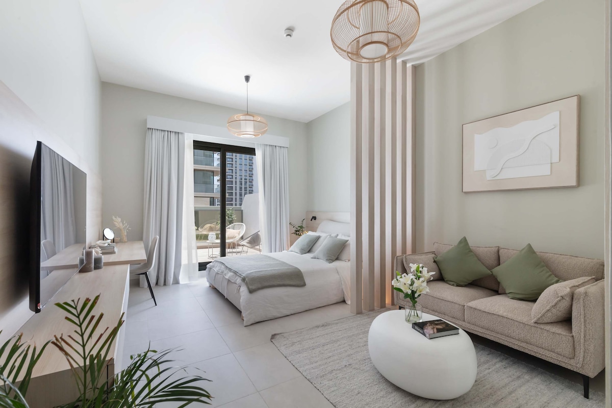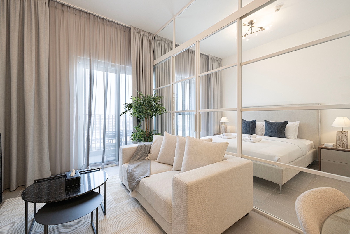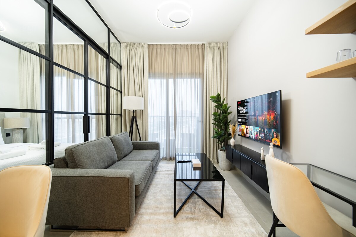 Settle into a sleek luxury studio at Sway Residence in the heart of Dubai Hills, designed as a calm, stylish retreat for modern city living. The open plan space blends contemporary elegance with everyday comfort, featuring a queen bed, chic lounge area, and a fully equipped kitchen arranged for easy routines. Floor to ceiling windows open onto a spacious balcony, filling the studio with natural light and setting ideal for solo travelers, couples, or business stays seeking a polished Dubai base.