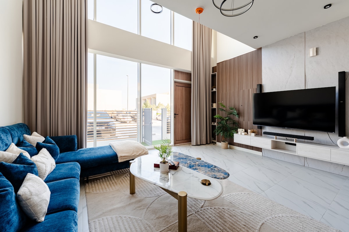 This modern, luxurious 5-bedroom villa comfortably accommodates 9 guests. Enjoy 5 stylish bathrooms, an open-plan kitchen with state-of-the-art appliances, & spacious living/dining areas. Relax in the outdoor kitchen with a built-in BBQ, comfy sofa, & freshwater pool. Located in Dubai Hills Estate, it's just 15 min from downtown Dubai, with biweekly cleaning & disinfecting for a pristine, stress-free stay. It's a perfect home away from home, with every detail designed for your comfort & privacy!