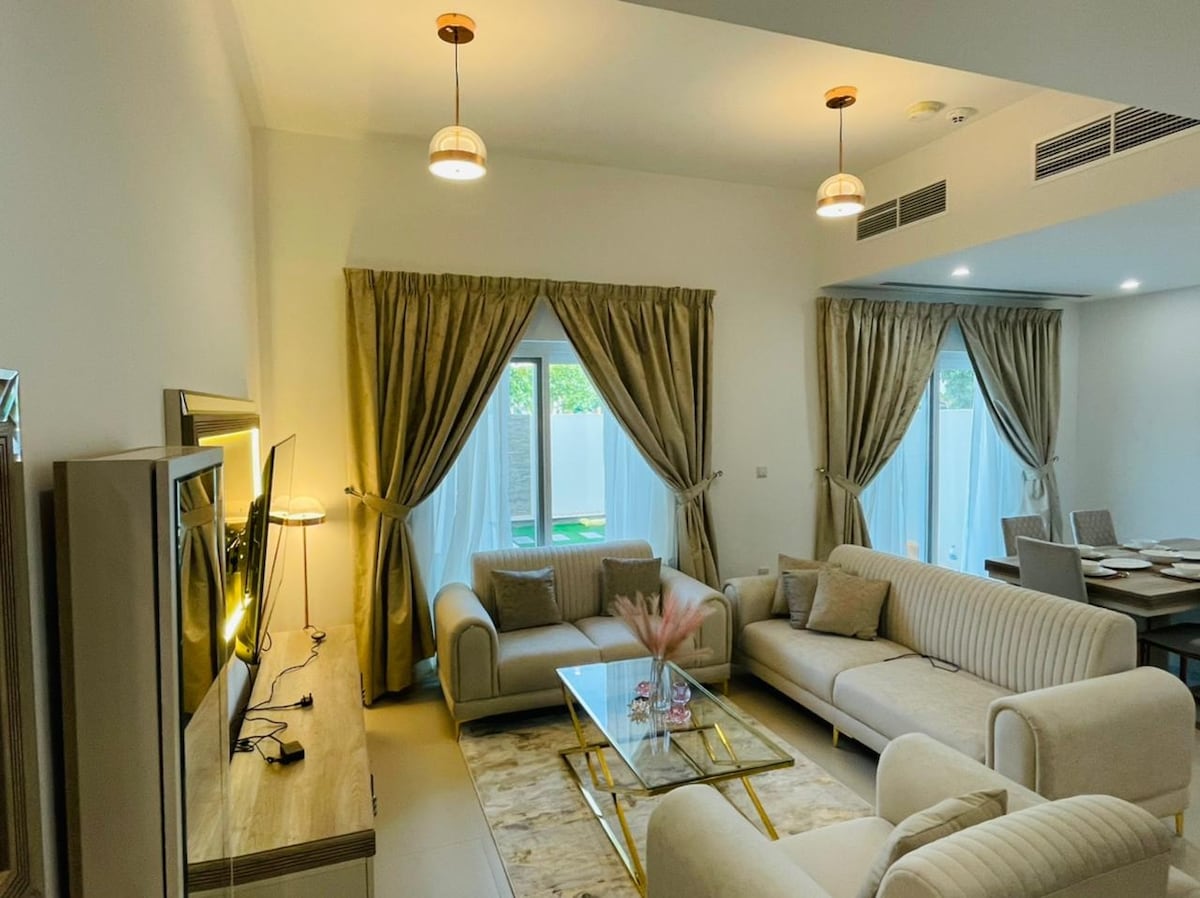 This elegant two floors villa in Dubai offers a perfect blend of modern luxury and desert tranquility. Spacious interior and stylish design, this villa ensures large room for relaxation and entertainment, making it a family-friendly retreat in the heart of Dubai desert. Sorry, but No Parties allowed! This Villa in Damac Hills 2 ( Vardon) is convenient located near the newly opened Water Town, Dubai Sport City, Dubai Autodrome, Dubai Miracle Garden, Outlet Mall, many more attractions.