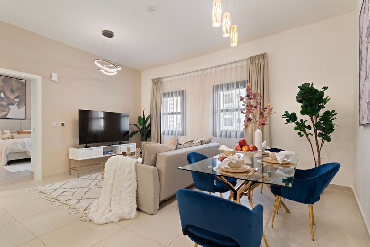 Brand-new 1-bedroom apartment in JVC, designed for comfort, light, and space. The bright living area includes a sofa bed for two additional guests, a fully equipped kitchen, and a modern bathroom with walk-in rain shower. Step onto the spacious balcony with outdoor seating and a hanging chair, perfect to unwind. Guests enjoy a resort-style swimming pool incl. outdoor jacuzzi, sun loungers, gym, and landscaped areas. Ideal for couples, families, or business travelers.