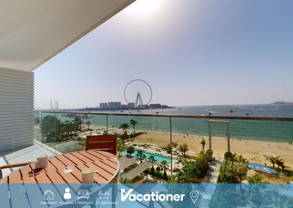 With breathtaking Dubai Eye, Palm Jumeirah and sea views, this lovely two-bedroom apartment features a luxury experience located in Jumeirah Beach Residence (JBR)- Rimal 6 Building. The Apartment is fully renovated, upgraded and all the furniture is brand new, just steps to the Beach. From both bedrooms and the balcony guests can enjoy their morning coffee while admiring views. The dining table seats six comfortably. The kitchen comes with all the necessary appliances. Welcome to Dubai