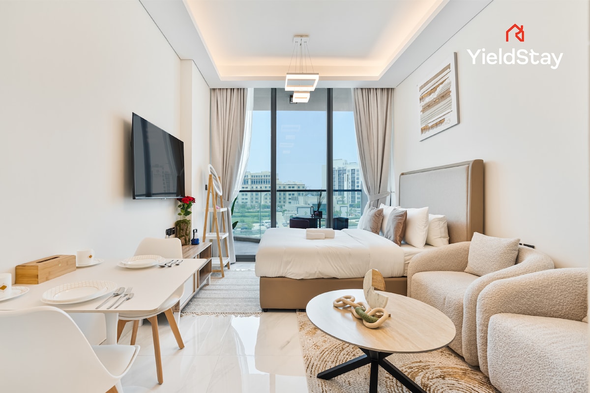 Chic studio apartment in the heart of Dubai, boasting a killer skyline view from the balcony. Just a quick 7-minute walk to Dubai and the mighty Burj Khalifa. Fully loaded for your trip, touristy or business, with all the essentials you could crave. Luxe hotel-style linens and towels for that extra comfy touch. Plus, score free access to a fully stacked gym right in the same building as well as a nice outdoor infinity pool!