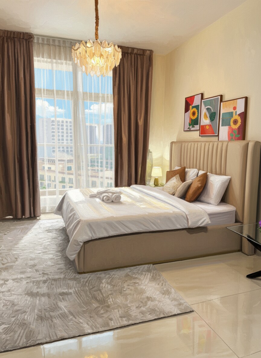 Experience elegance and comfort in our chic studio apartment with a large terrace in Downtown Dubai. Overlooking the Dubai Water Canal and within walking distance of Dubai Mall and Burj Khalifa, it’s the perfect base for your stay. Inside, enjoy a king-size bed, fully equipped kitchen, free WiFi, smart TV and complimentary parking. Whether traveling for business or leisure, our apartment blends style, comfort and location for an unforgettable Dubai experience.