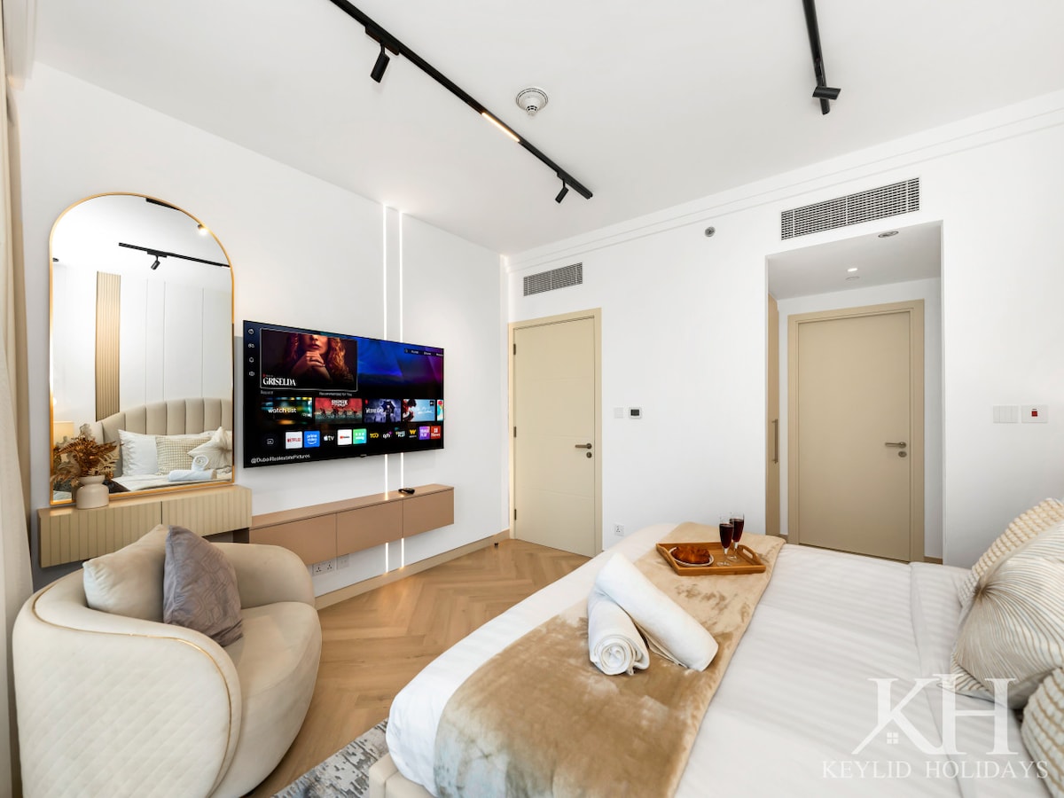 Experience coastal elegance at La Vie JBR, Dubai’s premier beachfront address. This luxury 2BR apartment features floor-to-ceiling windows, a private balcony with sea views, and a stylish living space with Smart TV. Cook in the modern kitchen or dine on JBR Walk, just steps away. Enjoy private beach access, a 31m infinity pool, gyms, kids’ play areas, and 24/7 security. Perfect for families, couples, or business travelers seeking comfort and style by the sea.