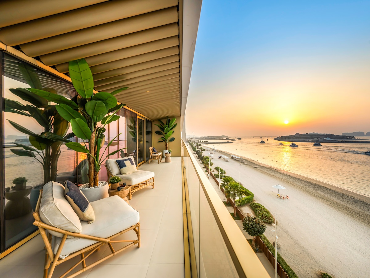 Welcome to LUX | The Atlantis View Luxury Beach Suite. Wake up to sweeping views of Palm Jumeirah in this bright and airy 3-bedroom beachfront apartment. The open-plan living space flows onto a generous balcony, perfect for soaking in the sea breeze. Ideally set between Dubai Marina and the iconic Palm, this prime location offers a unique mix of tranquillity and urban convenience.