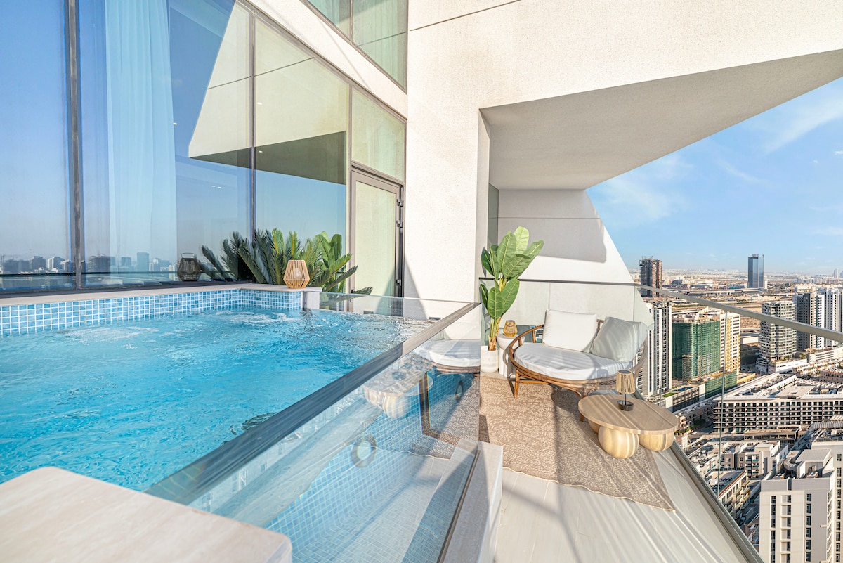 Escape to this cozy 30th-floor retreat with breathtaking panoramic views of Dubai's skyline, coastline, and landmarks like the Burj Khalifa. This luxurious home features a plunge pool on the balcony, modern interiors, and a serene atmosphere. Thoughtfully equipped for a seamless, relaxing stay for two, it's the perfect elevated escape in the heart of the city.