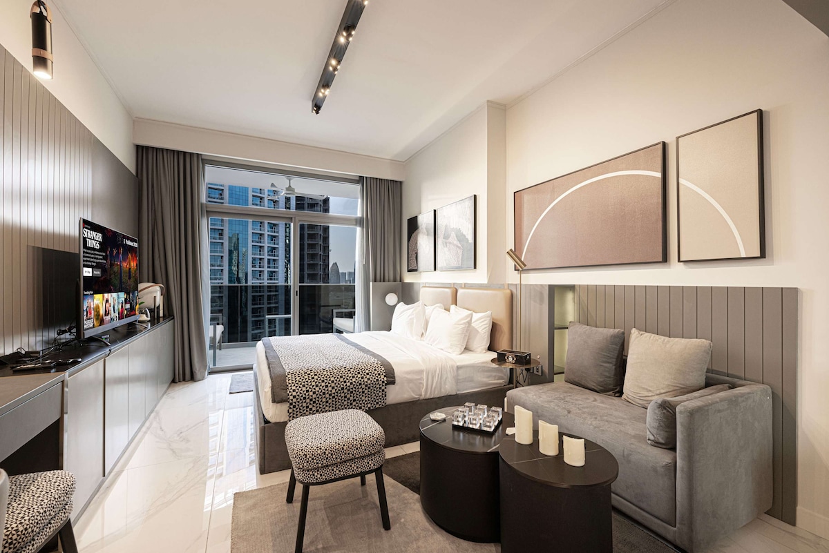 Perched high on the 29th floor, this immaculately designed and furnished studio pairs luxury with comfort. Wake to peaceful mornings and balcony coffee with beautiful open views; resort-level amenities below include a pool, full gym, and landscaped podium. Step out for canal walks, sunrise jogs, and breezy evening strolls. Downtown is minutes away. Dubai Mall is a 7-minute drive. Fast Wi-Fi and a fully equipped kitchen. Perfect for couples or business travellers seeking a calm, central base.