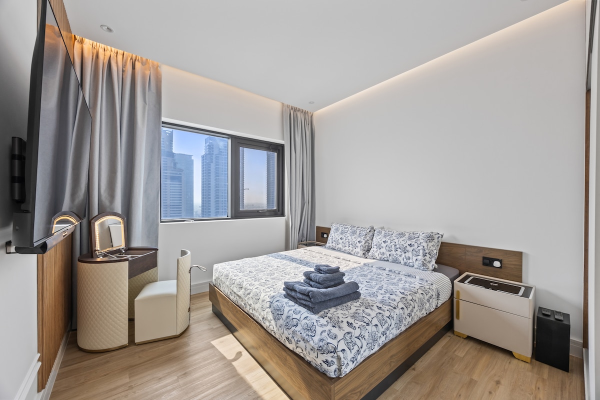 Welcome to our elegantly designed One-Bedroom Apartment located in the heart of Dubai’s vibrant Dunya Tower. Combining style, comfort, and convenience, this spacious retreat features a luxurious queen-size bed and a comfortable Sofa perfect for couples, small families, or business travelers seeking a relaxing stay in Downtown Dubai.