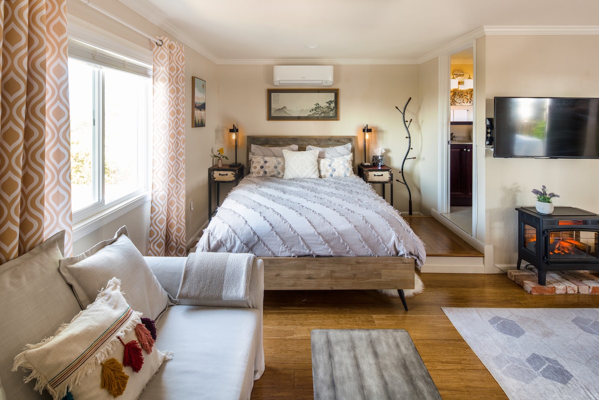 Detached Guest House that is on the same property of the main house. It is private, safe, and cozy 1br features a "Casper" queen bed. The living room features a twin-sized sleeper sofa, smart TV, and high-speed WIFI. Self-check-in with a keypad, for contactless and flexibility in arrival. Tesla EV charger also available to share For a more personalized experience, we kindly ask our guests to share the reason for their visit at the time of booking. Dogs are allowed with pet fee