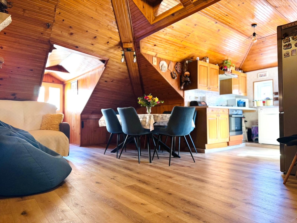 Vaulted ceilings and roof beams give an authentic charm to this home which features an eclectic decor and rustic-chic aesthetic. Skylights bathe each room in natural light and you can enjoy performances and concerts from the windows on the right day. Besides all the usual equipment necessary for everyday living, it is a kind of art atelier due to musical instruments, easel and my mother's theater photos and posters around. If you appreciate art this is a perfect atmosphere for you..