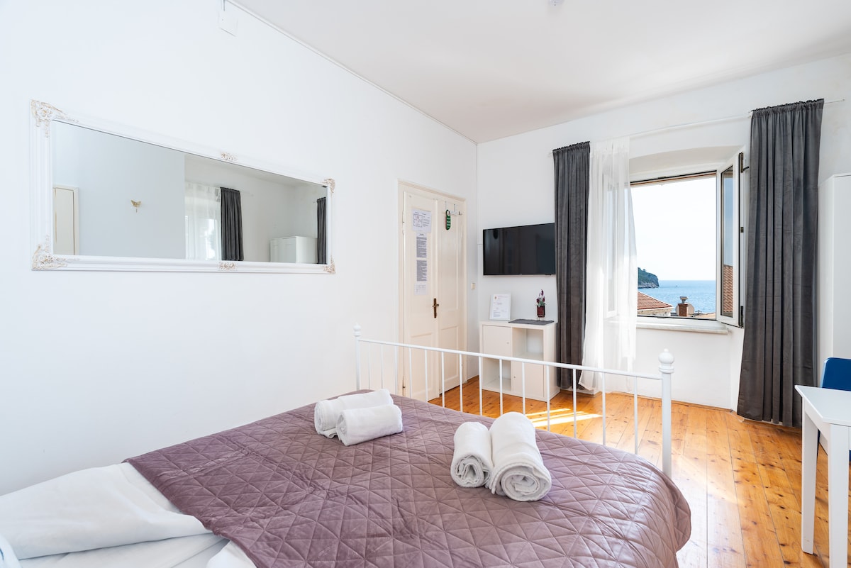 This charming room with furnished balcony is placed in the attic of the family house that consists of 5 guest rooms. There is a double bed for two in it and a sofa bed. The room is air conditioned and equipped with TV, a fridge, kettle and free Wi-Fi. It has its private well- equipped bathroom placed in the hallway (towels, shower gel, shampoo provided). From its private balcony you can enjoy the breathtaking panoramic vistas of Dubrovnik surroundings and the sea.