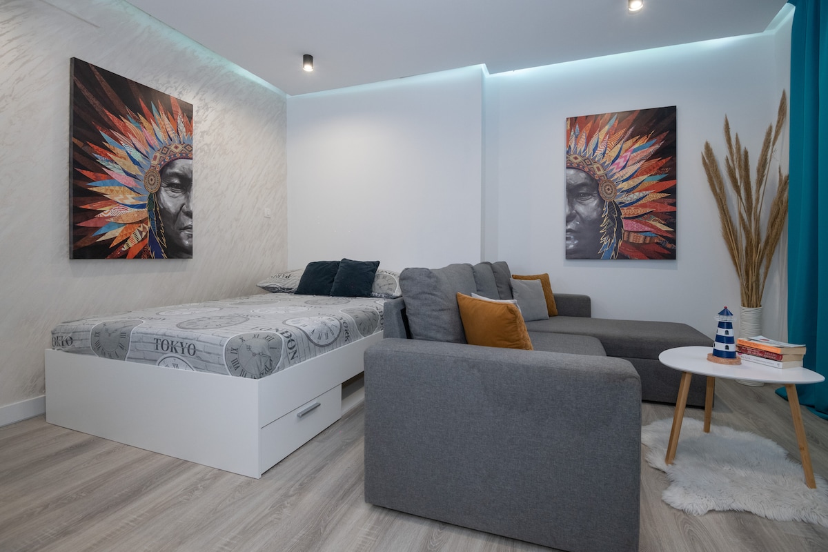 Lijepi studio s bračnim krevetom. Ispred Apartmana se nalazi predivna terasa sa cvijećem te prostranim stolom i stolicama gdje možete uživati i odmarati. Na terasi je dozvoljeno pušenje. U blizini se nalaze razni restorani,kafići trgovine, taxi i autobusna stanica za javni gradski prijevoz te dostupan parking uz naplatu. Apartman se nalazi u blizini glavnog autobusnog kolodvora (odlična povezanost sa ostatkom Hrvatske i zemaljama u regije) te luka koja povezuje grad sa otocima.
