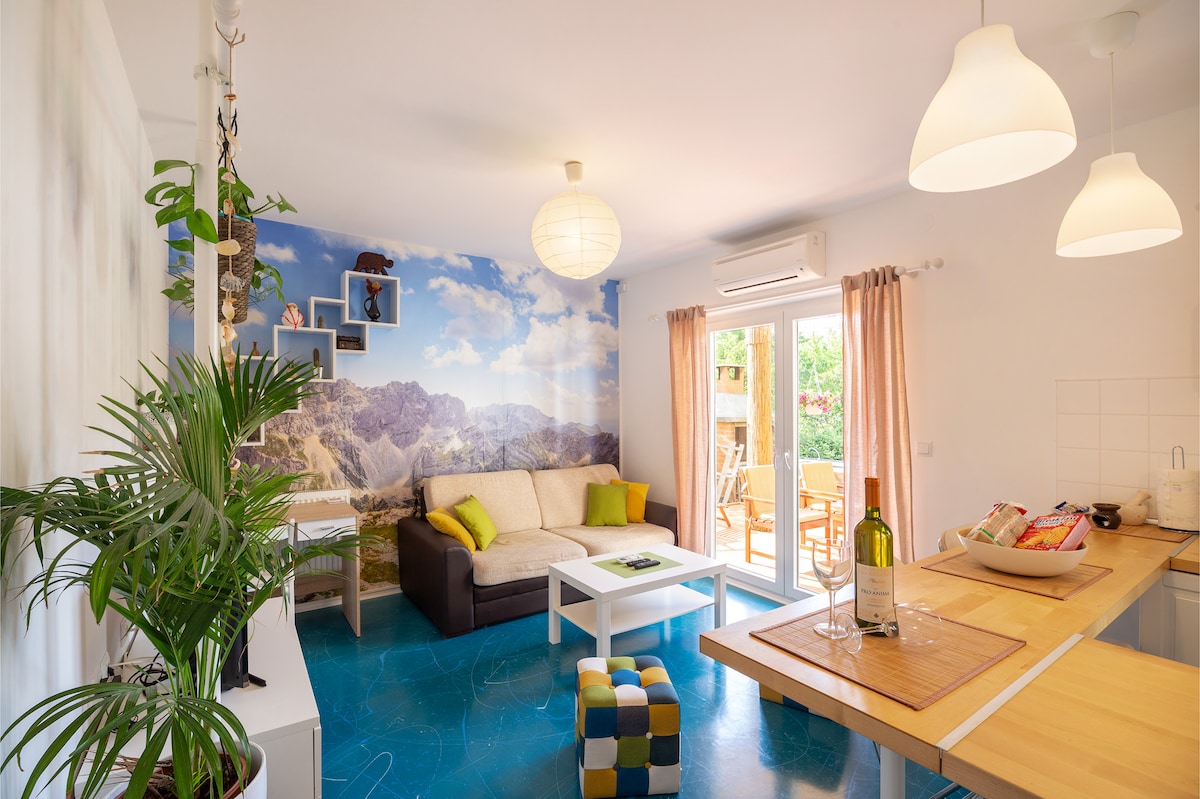 Dear guests, Our apartment is modern, simple and brand new. It is located in the most beautiful part of a private house on the first floor, in peaceful area, near the pine forest, outside the city centre, 20 minutes by walk along the coastal path to the Old Town Korčula. Just in the front of the house is nice seating area with views of the olive trees.On the first floor is closed terrace with views of pine wood and mountain.