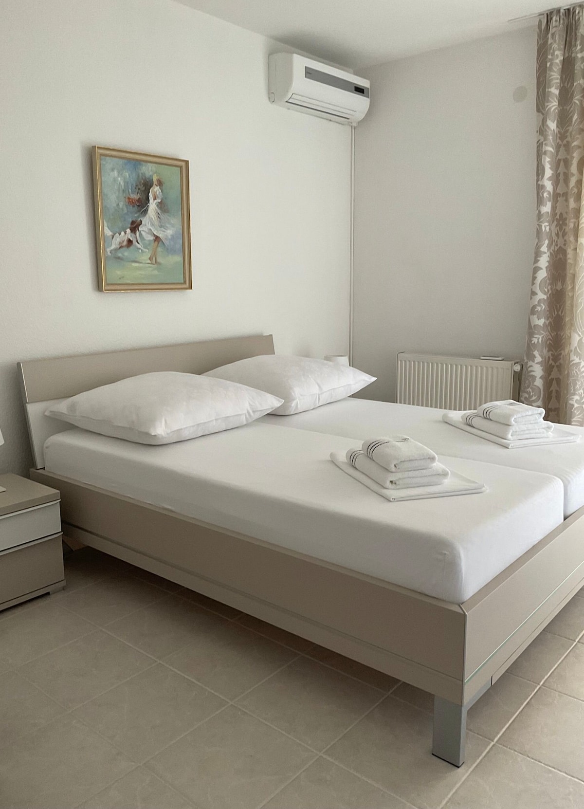 Hell und freundlich erwartet Sie unser komfortables 50 qm großes 4 Bett Apartment (A1) mit einem zusätzlichen Hilfsbett bei Bedarf. Das Haus, in welchem sich ein weiteres Apartment (B1), mit adäquater Kapazität befindet, liegt in einer ruhigen Einbahnstraße. Es ist beidseitig von einer großen Außenterasse umgeben, welche im hinteren Teil des Hauses, an einen dicht bewachsenen Wald grenzt und somit ungestörte, erholsame Stunden bietet. Ein ausreichend großer Privatparkplatz bietet vor dem Haus Platz für Ihre Fahrzeuge. Das klimatisierte Apartment "A1" verfügt über zwei Schlafzimmer mit je einem Doppelbett und zwei verückbaren Einzelbetten, einer voll ausgestatteten offenen Küche einem gemütlichem Wohnbereich mit TV, Flur sowie einem Duschbad mit WC und Fön. In der Küche sind Kühlschrank, Kochfeld, Backofen und eine Spüle integriert. Handtücher und Bettwäsche werden gestellt. Abseits des regen Treibens am Strand oder in der Stadt bieten Ihnen verschiedene Sitzgelegenheiten im Garten eine kleine Oase der Entspannung die Sie ganz nach Ihren Wünschen z.B. zum Frühstücken nutzen können. 500 m trennen das Haus vom kristallklaren und für seine Sauberkeit bekannten adriatischem Inselmeer mit Kiesstrand und naturbelassenem Buchten.