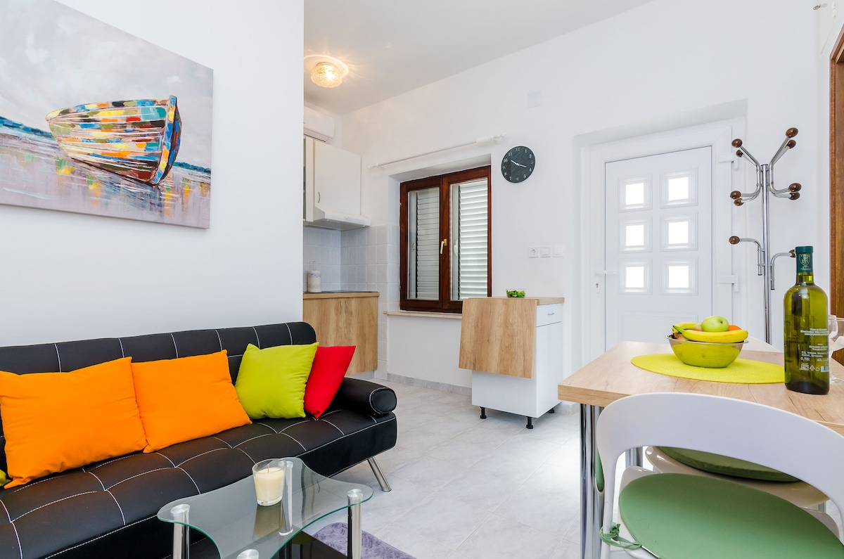 The apartment is well located, 15 minutes walking distance from Old City, surrounded by rocky beaches less than hundred meters far, and the pebble one around 200 m. Small terrace in shadow of Olive tree and Pergola, Flower garden, peacefull area ... Regarding very small separate room, apartment is perfect for two adults or family with two children or young people who don`t mind sleeping on bunk bed .