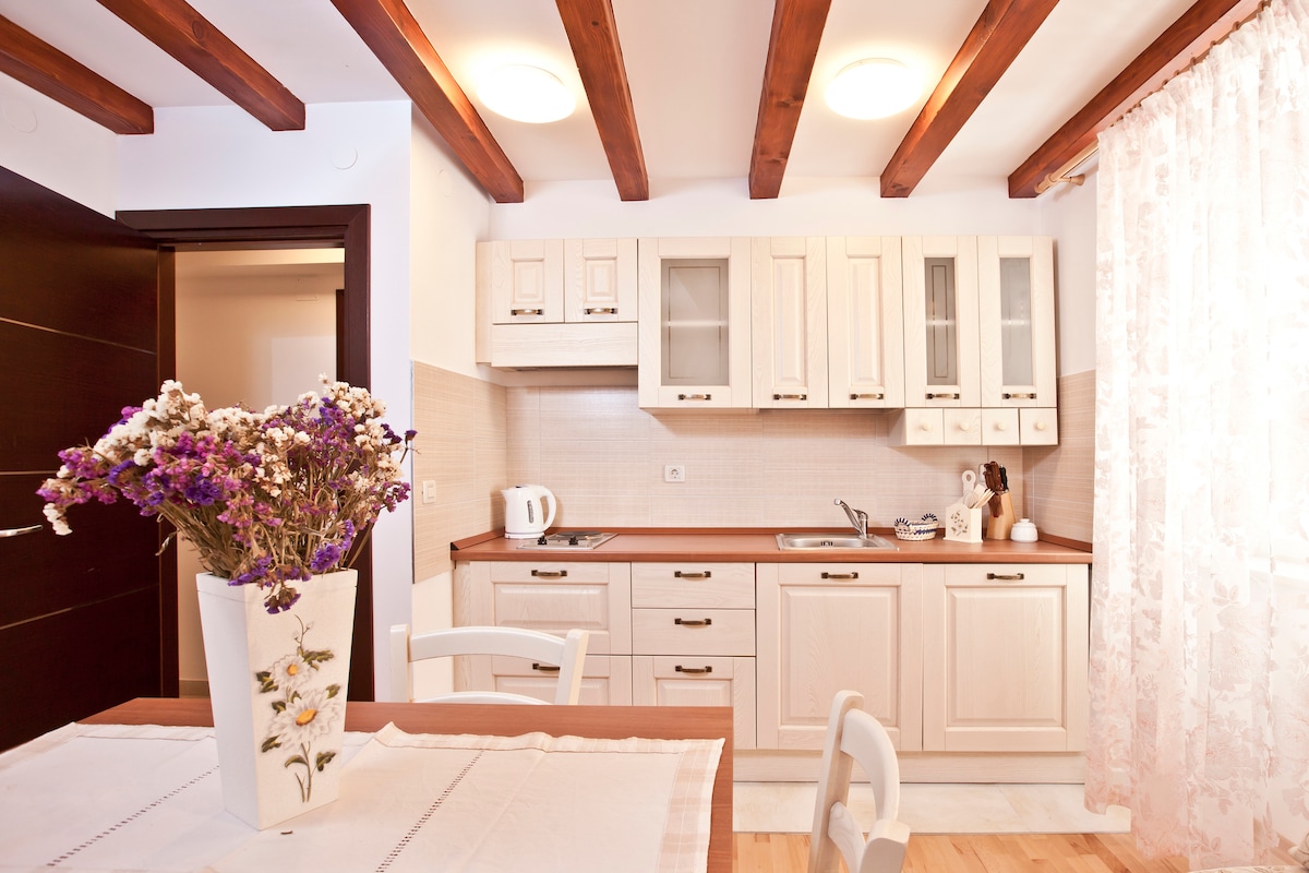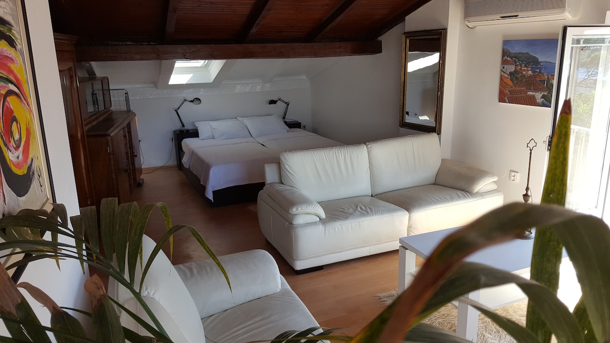The house, in which the apartment is located, is a cultural-historic preserved building, built in the XVII th. century. The accomodation unit with a private entrance presents a large and comfortable two-stories apartment with a beautifull panoramic view of the Old Town of Dubrovnik. Located just across the City Walls, accommodation is surrounded by lush garden which provides much needed privacy, plenty of space and tranquility. Includes private garage, parking is free (reservation is needed)