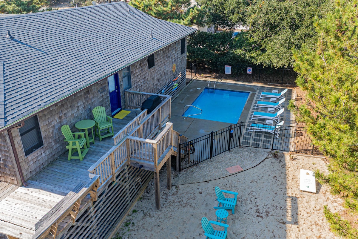 Updated Beach Cottage, short 5 min walk past 7 homes to the beautiful uncrowded beach. See reviews! Soundfront community pool 5/19-10/13 & tennis! Modern kitchen, baths, flooring, furnishings, appliances, decor. Comfortably sized bedrooms, open great room & dining. (1 K, 1 Q, 2 Twins). 2 TV's. Open decks, large screen porch, laundry, grill. Linens provided. Very quiet low density family neighborhood. Walk/bike to beach, Town of Duck for shopping, dining, soundfront boardwalk, & watersport fun.