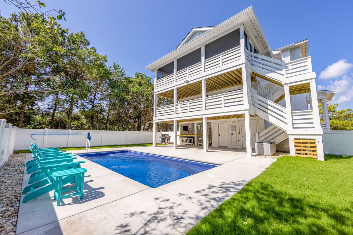 Duck Mountain beach house is located in Duck’s Carolina Dunes Subdivision. The house is located high on a Dune with a great view of the Sound. Private beach is down the street for guests only. Large pool with Polywood Furniture, this house is ready for guests who prefer a luxurious home with all the amenities ! Living spaces and all bedrooms renovated in 2021 renovations in all bathrooms 2022 Outdoor showers renovated 2023