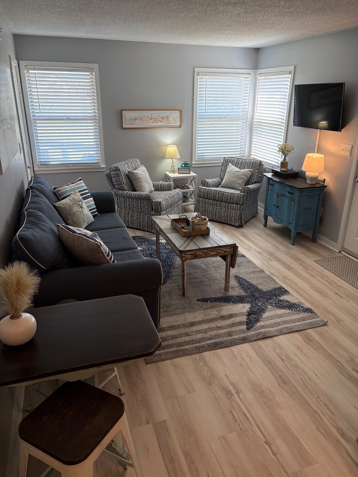 Kick back and relax in this calm, stylish space. Only steps from the beach and a short walk to the community pool. A private paradise awaits you at "Sit N' Duck." This is a new second floor luxurious 1 bedroom apartment on a shared floor offering a king bed, full bathroom, living room and kitchenette. Luxurious linens & towels provided. Enjoy smart televisions in both the living room and bedroom. Take a short walk to the beach access only steps from the driveway or visit the community pool!