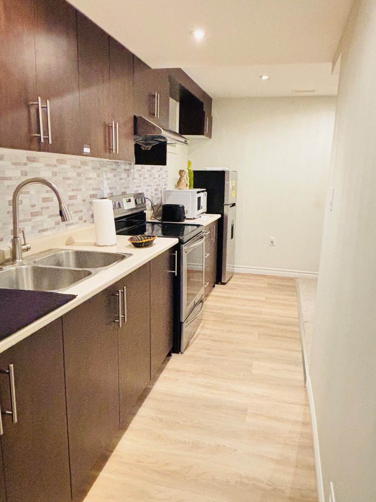 Entire ground level walkout basement with lots of exposure to natural light. It's fully equipped with 1 private bedroom & 1 additional bed in living area with a scenic view of backyard .Door can only be locked from inside.(not outside) Attached Private Washroom to bedroom is available . High speed internet is available.Parking spot on the property. Small bar fridge & microwave available in basement .