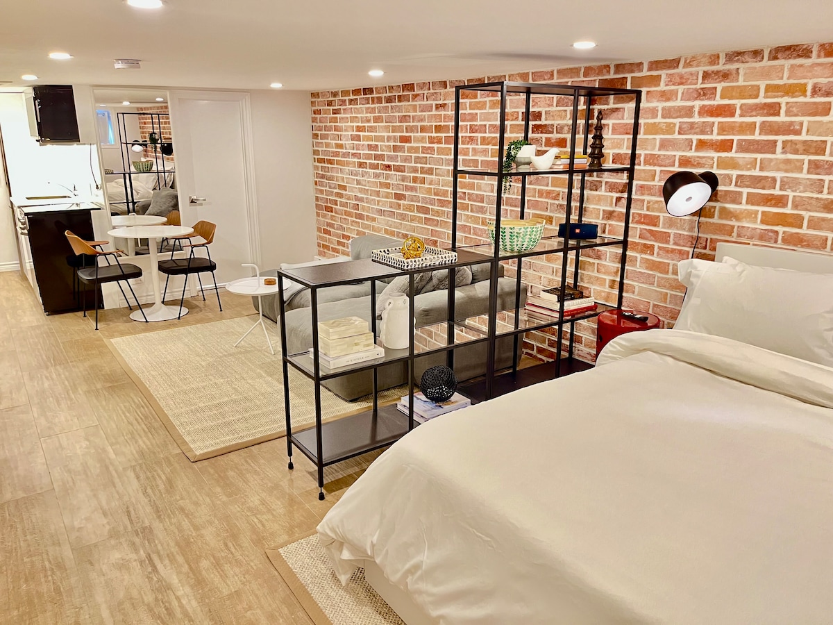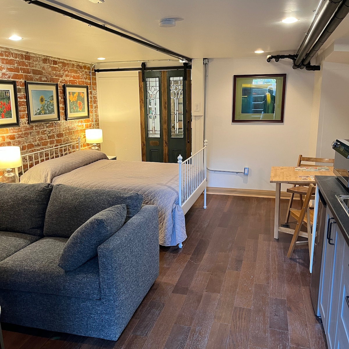 From the exposed brick, to original artwork, to massive private bathroom with double vanity, this basement suite in our home has been renovated and decorated to feel like a loft. The double bed is brand new with a 16" mattress sure to deliver an excellent night's sleep. You will find a brand new, 42" smart TV resting on a unique mantlepiece refashioned from an antique upright piano, as well as a kitchenette with convection oven/air fryer, Keurig coffeemaker, and stainless steel mini fridge.
