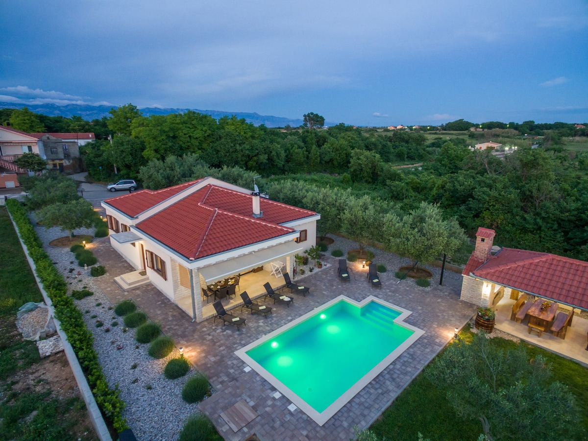 This beautiful villa with heated pool, hot tub and sauna is set on a remote and secluded landscape with a breath-taking view over the valley Heated pool from April to November Great place for relaxing and a starting point for exploring the region and Croatia! City distance Zadar is 28 km (airport 20 km) away Šibenik is 50 km away Split is 125 km (airport 99 km) away Attraction distance Plitvice lakes 125 km away Krka 45 km away Kornati 30 km away