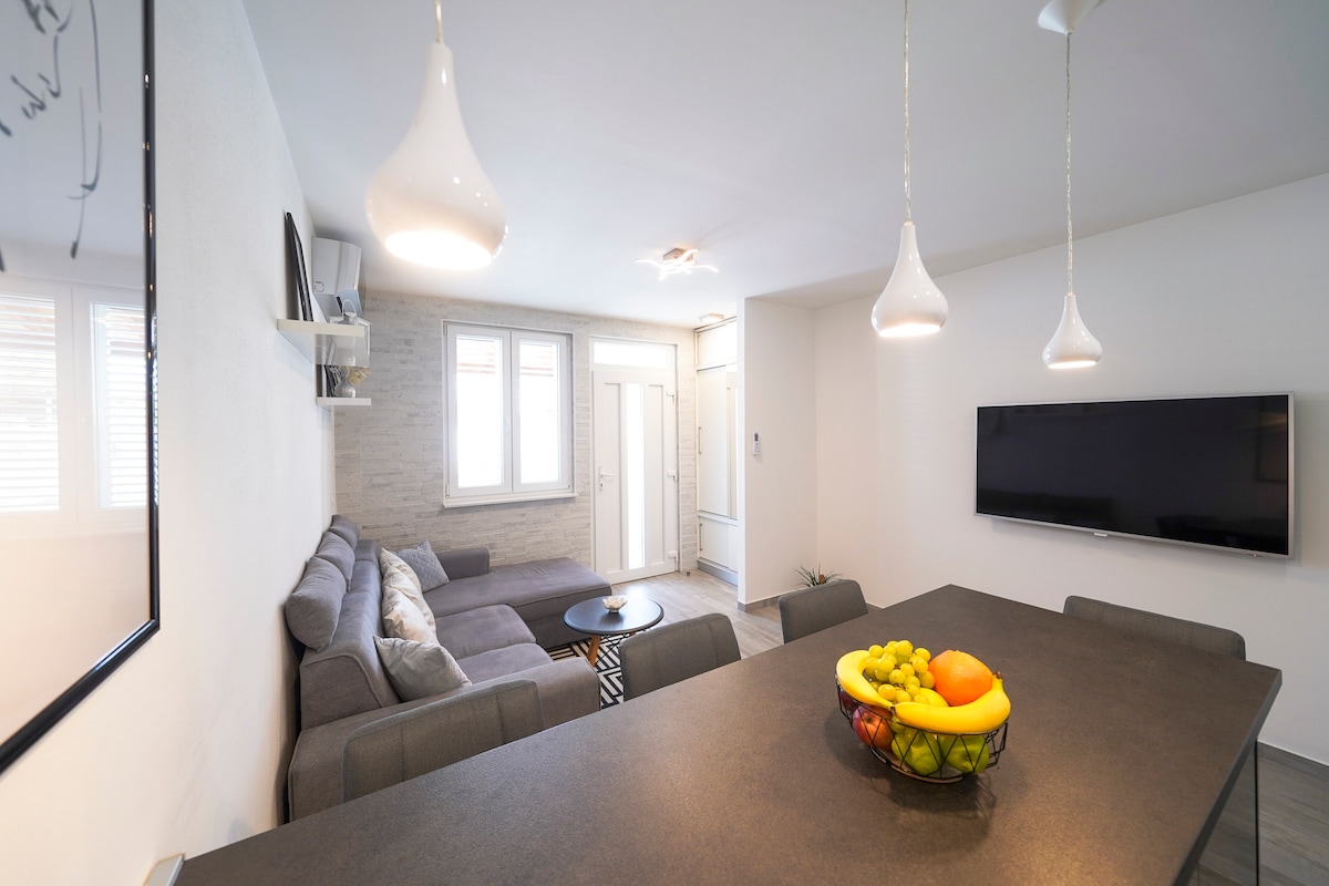 Sparkling clean and modern apartment close to the city center of Zadar in less then 15-20 min walking distance, a grocery store right next to it, located in a quite neighbourhood with a private and spacious (wooden covered) terrace and a parking place. One bedroom with a comfortable super-king size bed (200 x 180 cm), walk-in shower, high-speed fiber optic WiFi connection, fully equipped kitchen, radiator heating and A/C system. Digital nomads coworking station “Coin” only 5 min.