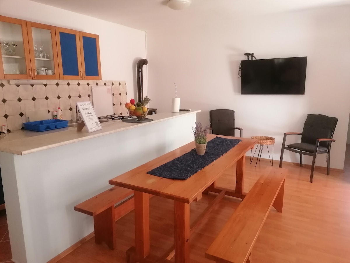 Jednosoban apartman (2+2 osobe) u sklopu kuće. U sklopu kuće su još tri apartman, a gostima je na raspolaganju i velika okućnica (800m2) te besplatan parking. Svaki apartman ima poseban ulaz i poseban balkon s pogledom. Od zajedničkih prostora gostima je na raspolaganju i bazen te sjenica u sklopu koje je i kamin. Cijeli prostor ograđen je visokom ogradom što gostima pruža intimu i privatnost.