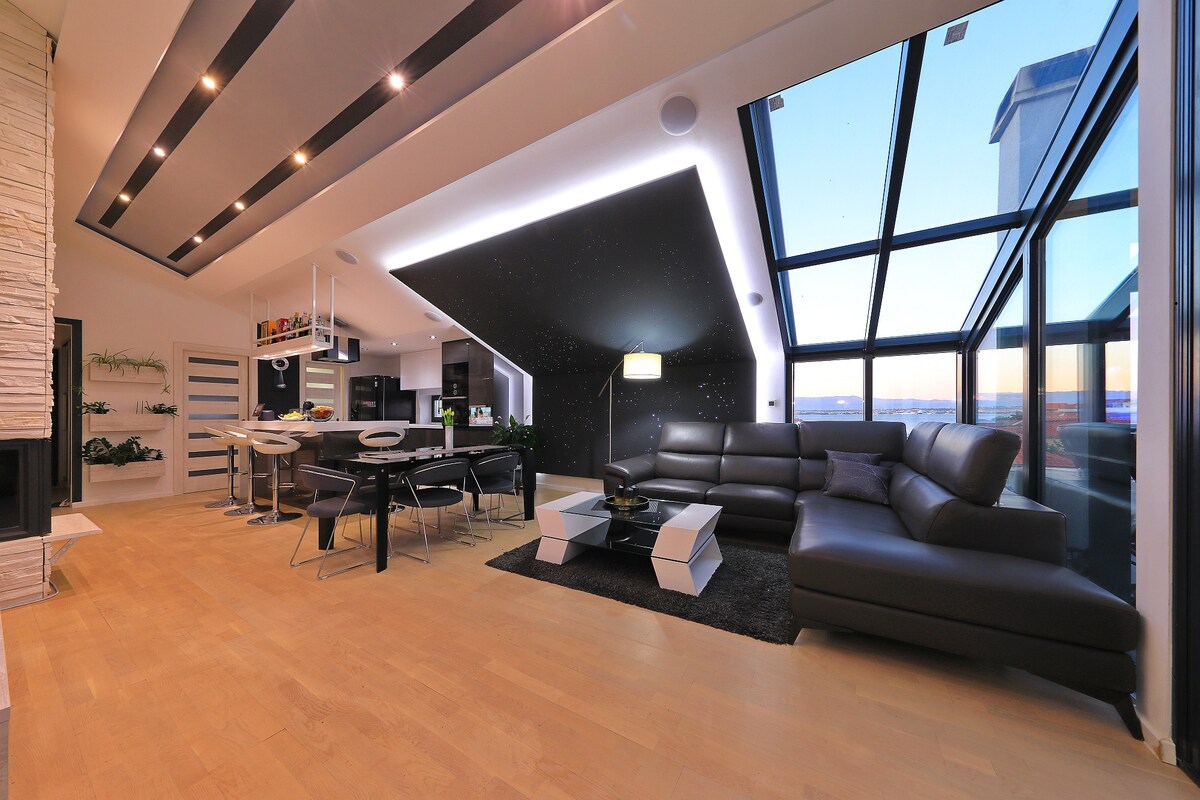The Penthouse you've always dreamed of is waiting for you in Zadar! This newly made penthouse with a rooftop terrace with a hot tub, lounge area, and sauna is designed for those who want a royal experience for their holidays. This penthouse has two bedrooms, two bathrooms, a living room, and a kitchen as well as a roof terrace and a private parking spot. It is located 10 minutes walk from the old center of Zadar. Let me take you through the interior of our penthouse.