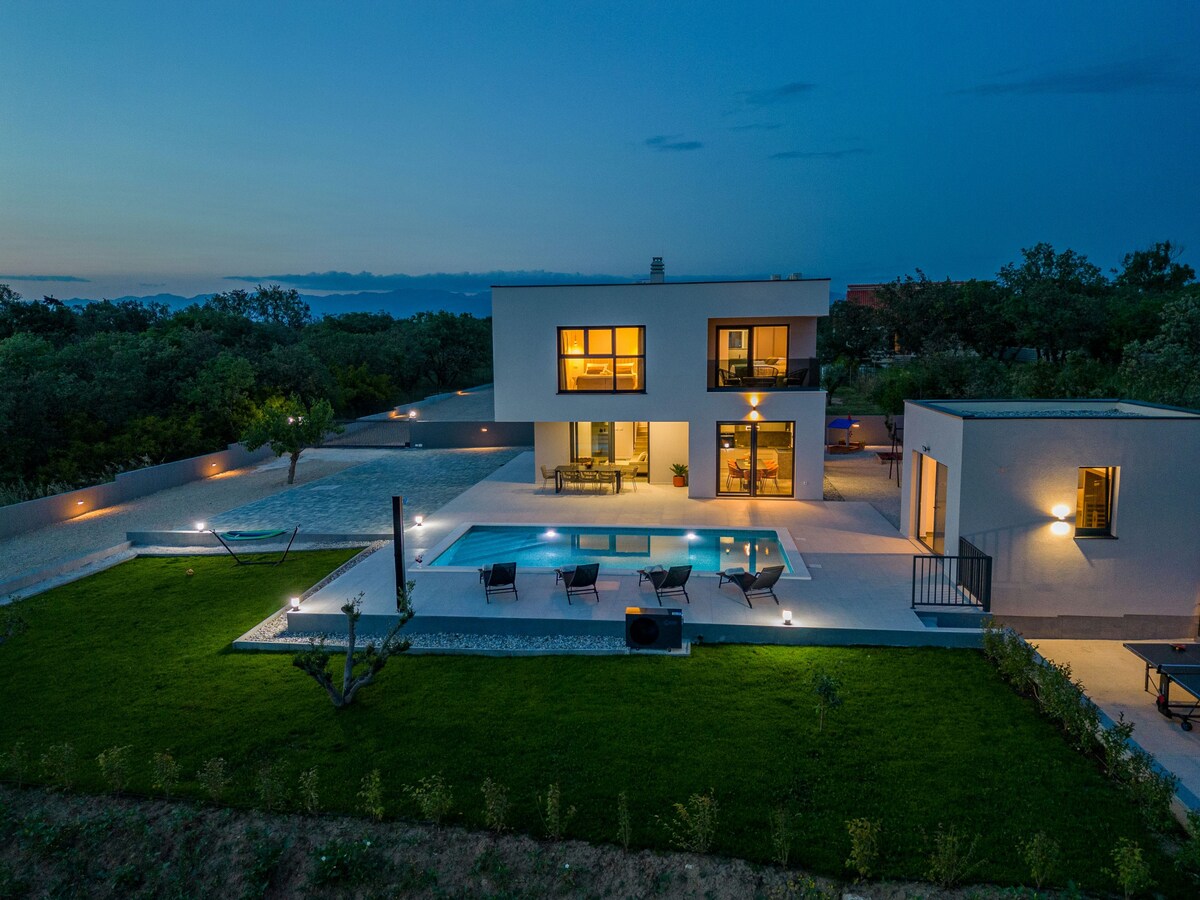 This beautiful villa with heated pool, hot tub and sauna is set on a remote and secluded landscape with a breath-taking view over the valley Heated pool from April to November Great place for relaxing and a starting point for exploring the region and Croatia! City distance Zadar is 28 km (airport 20 km) away Šibenik is 50 km away Split is 125 km (airport 99 km) away Attraction distance Plitvice lakes 125 km away Krka 45 km away Kornati 30 km away