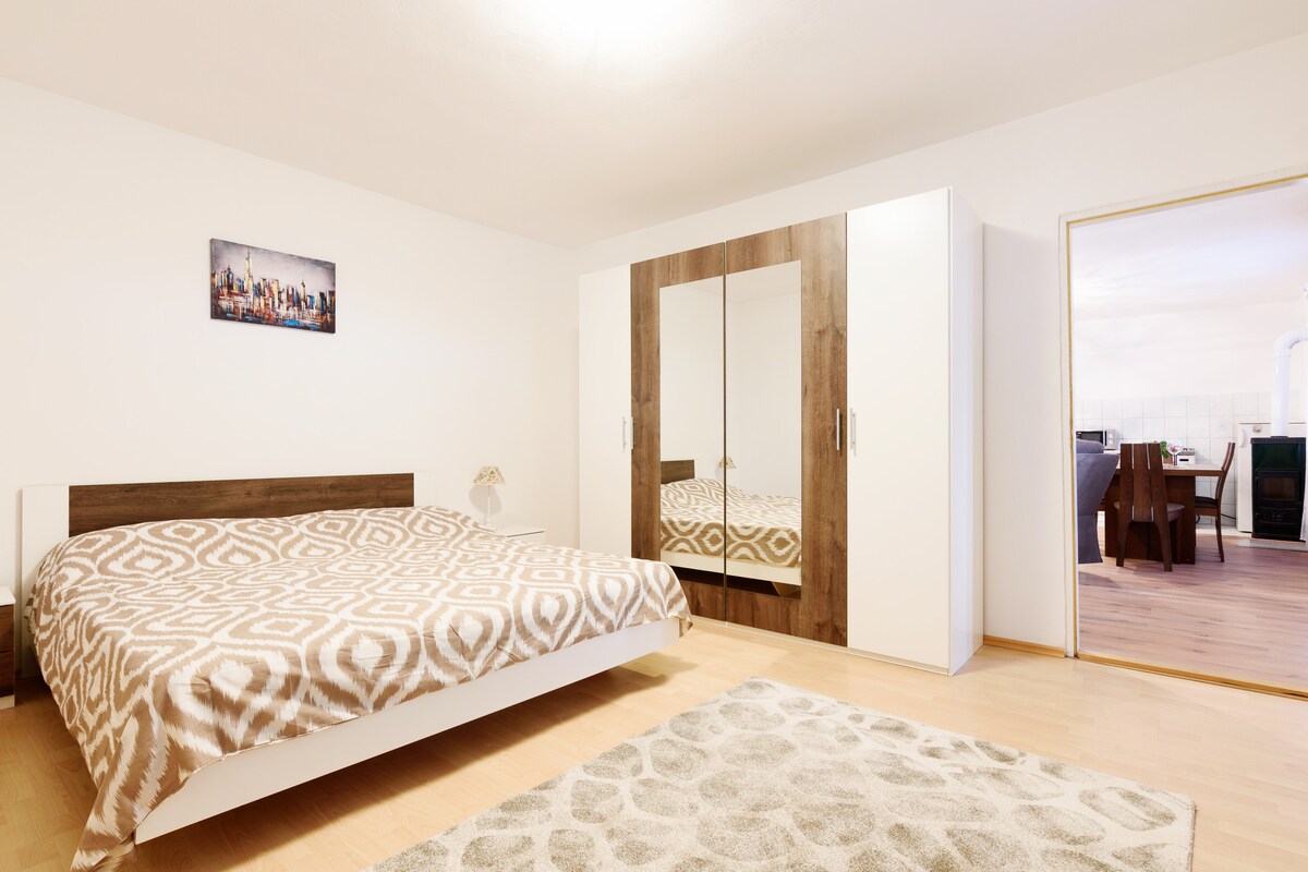 Prostran apartman s spavaćom sobom , osigurani parking. Pogled na vrt, mirni kvart sa pristupačnim sadržajem.