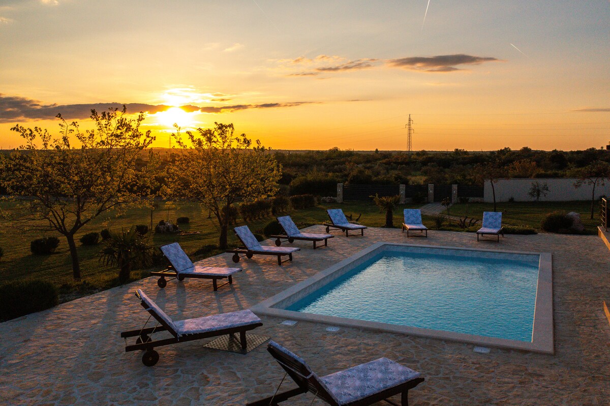 This beautiful villa with heated pool, hot tub and sauna is set on a remote and secluded landscape with a breath-taking view over the valley Heated pool from April to November Great place for relaxing and a starting point for exploring the region and Croatia! City distance Zadar is 28 km (airport 20 km) away Šibenik is 50 km away Split is 125 km (airport 99 km) away Attraction distance Plitvice lakes 125 km away Krka 45 km away Kornati 30 km away