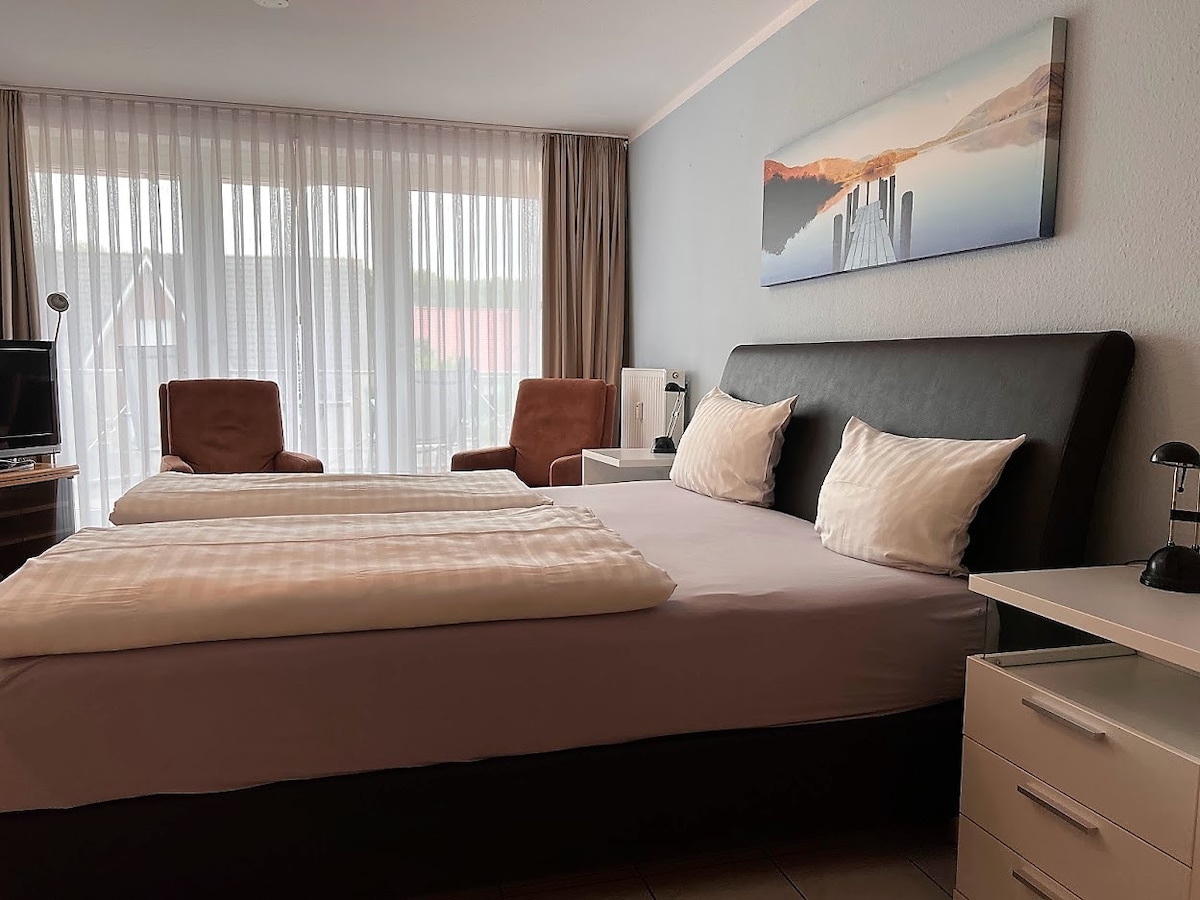 Unser helles 1-Raum-Appartement im Erdgeschoss mit Balkon ist für Singles perfekt geeignet. Der Wohnschlaftraum besteht aus einem Boxspringbett, einem kleinen eingebauten Kleiderschrank und einer gemütlichen Sitzgruppe. Zur Ausstattung der Küchenzeile gehören unter anderem eine Kaffeemaschine, ein Toaster und ein Wasserkocher. Unsere Balkone sind mit einem Sichtschutz zum Nachbarbalkon ausgestattet und Sie können den Abend entspannt ausklingen lassen. Gerne darf Sie ein Hund begleiten.