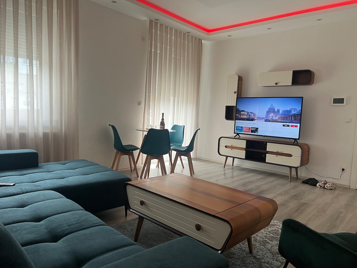 Beautiful 65 m² apartment in the heart of Duisburg with a large balcony 🏖️ (incl. seating area & Strandkorb) and perfect connections to Duisburg Central, Düsseldorf & Messe Düsseldorf 🚆 Highlights: U-/tram stop (Platanenhof) 200 m (U79/903) 🚋 Central yet quiet 🌳 Underfloor heating 🔥 Fully equipped kitchen 🍽️ Home office space 💻 Rain shower 🚿 In-room bar 🍷 Smart TV with Netflix 📺 Ideal for city trips or business stays ✨ Fast charging station for electric cars right on the street ⚡🚗