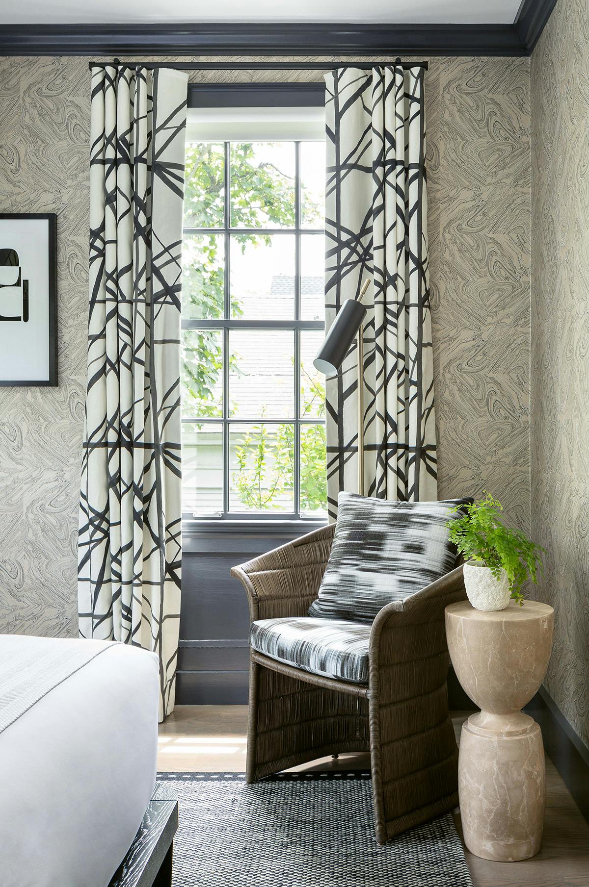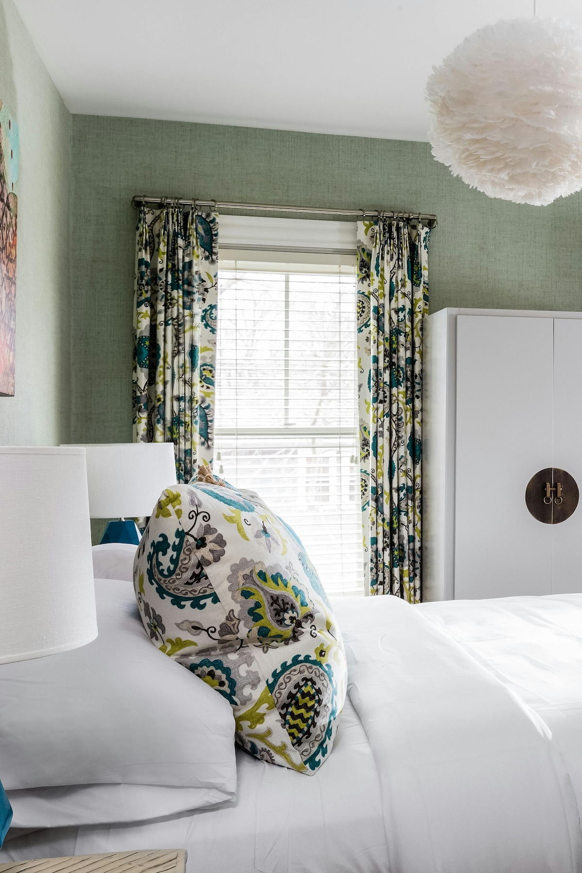 Room 3 is an intimate king room located in a cozy corner on the 2nd floor of The Coco. This 125 square foot space offers high ceilings, hardwood floors, 40" flat screen TV, plush bathrobes, Lather bath products, and a private bathroom with a shower. Other elements include Japanese-inspired coastal wallpaper, a scalloped bed frame, fringe chandelier, walnut armoire, and a comfy reading chair.