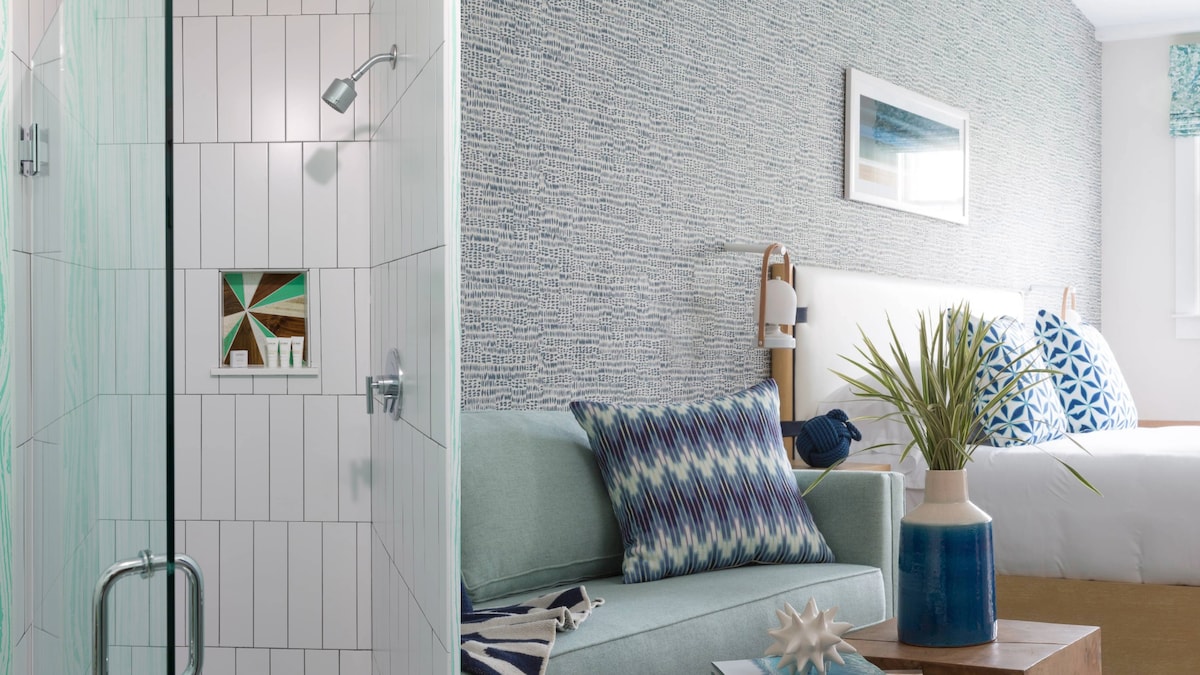 The three (3) King Deluxe rooms at our boutique Edgartown hotel can accommodate two total guests each. Varying from 245-280 square feet each, one is located on the second floor adjacent to The Richard and King Suites (great for groups traveling together). Each room offers a plush king bed, and each its own unique style and function. All of these rooms also offer a 43" LED Smart TV, a safe, blackout shades, and USB outlets, in addition to individually-controlled AC and free wireless internet.
