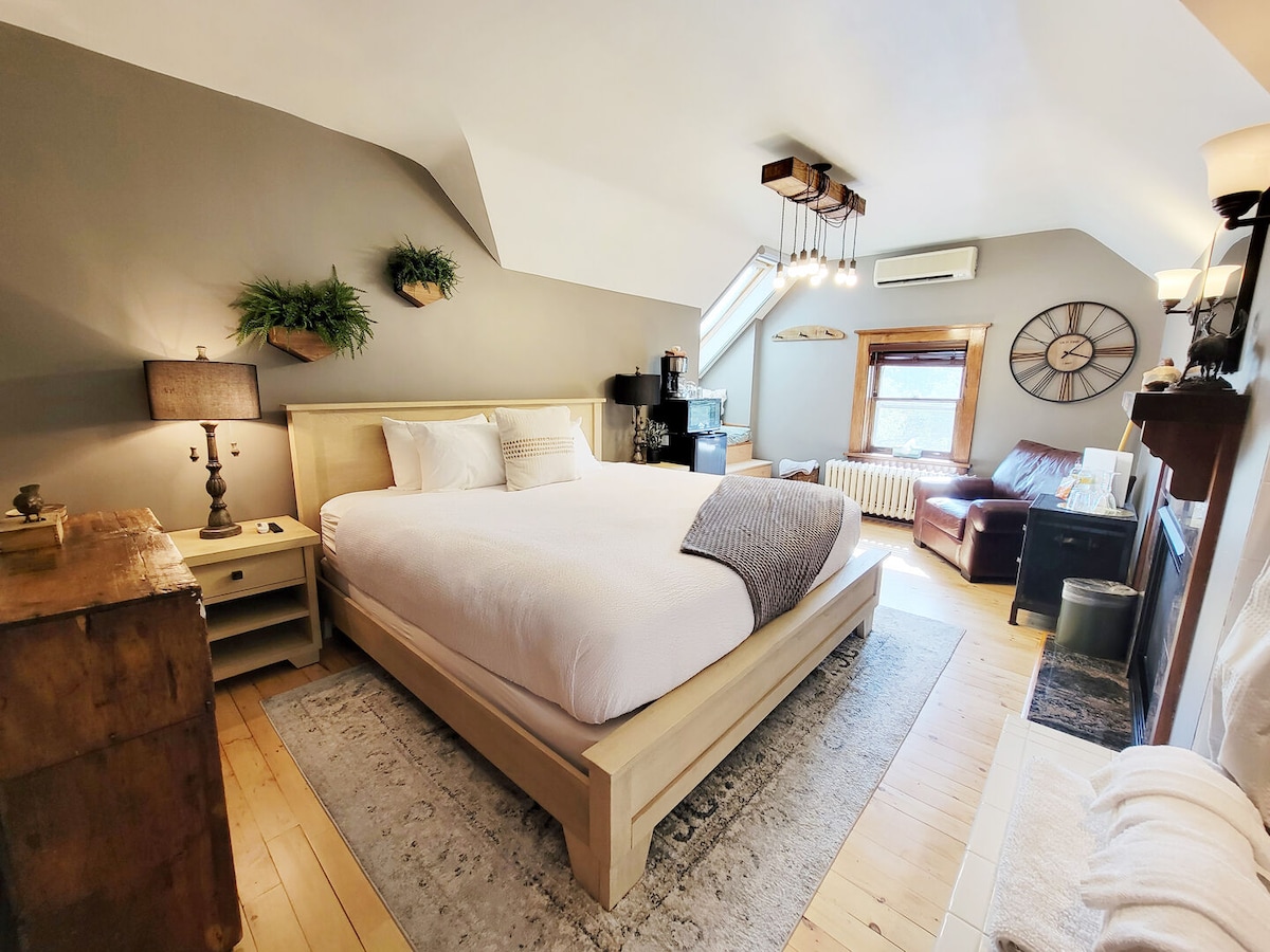 Superior Suite is a beautifully remodeled third-floor suite that blends historic character with refined design. Moody finishes are paired with a striking Lake Superior view, creating a space that feels both dramatic and welcoming. The suite features a Samsung Frame Smart TV, wet bar, fireplace, spacious bathroom, and an in-room jetted tub. A king bed and a sofa bed behind French doors offer flexible sleeping arrangements, along with a refrigerator, microwave, coffee maker, and Netflix access.