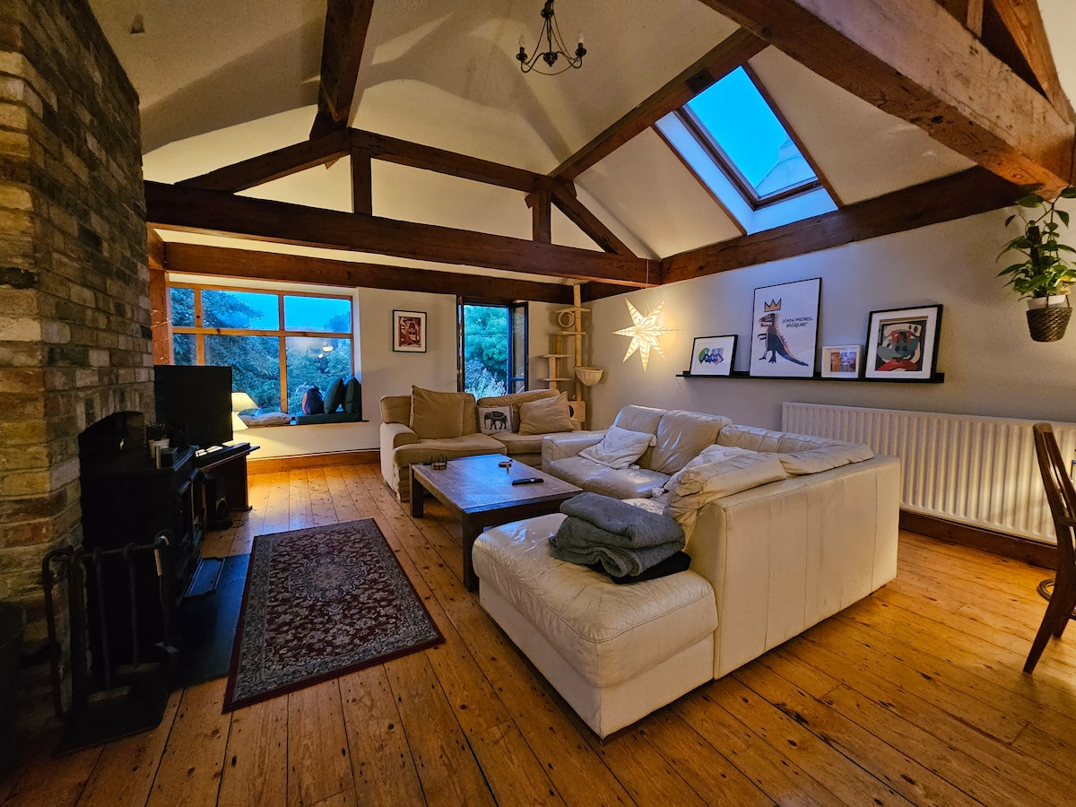 2B is a charming, unique 1 bedroomed flat on the Luas with spiral staircase, patio, new cooker and fridge, outdoor decking area. Upstairs bedroom has a King size bed and a fold out to double bed downstairs. This cosy flat is ideal if you need a rest after travelling with peaceful surroundings; outdoor patio, warm wood burning stove indoors. It is the perfect recharge and convenient to Dublin City Centre only 10 mins on Luas (5 min walk to Luas). I have a dog who might even say hi! No parties:)