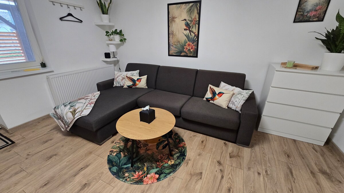 Welcome to our cozy apartment with air conditioning and a private garden, located in a quiet area of Miloslavov, just 15 minutes from Bratislava. Perfect for families with children and guests working remotely. Pets are welcome. Fully equipped kitchen, comfortable living room, and free parking right in front of the apartment. Shops, restaurants, and sports facilities nearby. We look forward to hosting you and making your stay comfortable and enjoyable. Feel free to contact us with any questions.